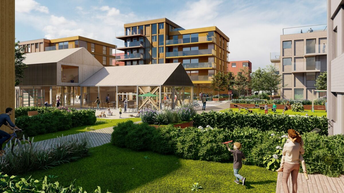 Fellesområdene får en sentral rolle i utformingen, med blant annet et gårdsrom med pergola og takterrasser for både bolig- og næringsseksjonene.